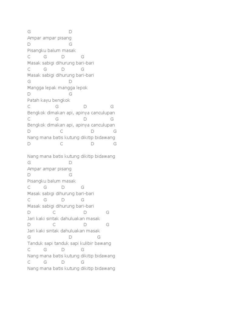 Not angka lagu syukur ini sangat banyak dicari terutama oleh siswa sekolah. Lagu ini menjadi lagu wajib penilaian saat ujian semester. Ampar ampar pisang artinya pisang yang disejajarkan. Jadi, kalau sudah bisa baca not angkanya, mestinya bakalan gampang. Lagu ini juga sering digunakan untuk praktek bermain pianika. G d mangga lepak mangga lepok d g patah kayu bengkok c g d g bengkok dimakan api, apinya canculupan c g d g bengkok dimakan api. G d ampar ampar pisang. Sebenarnya lagu ampar ampar pisang berasal dari daerah kalimantan selatan. Halaman 1 dari 1, sekitar 1 lagu ampar ampar pisang yang telah diupdate.
