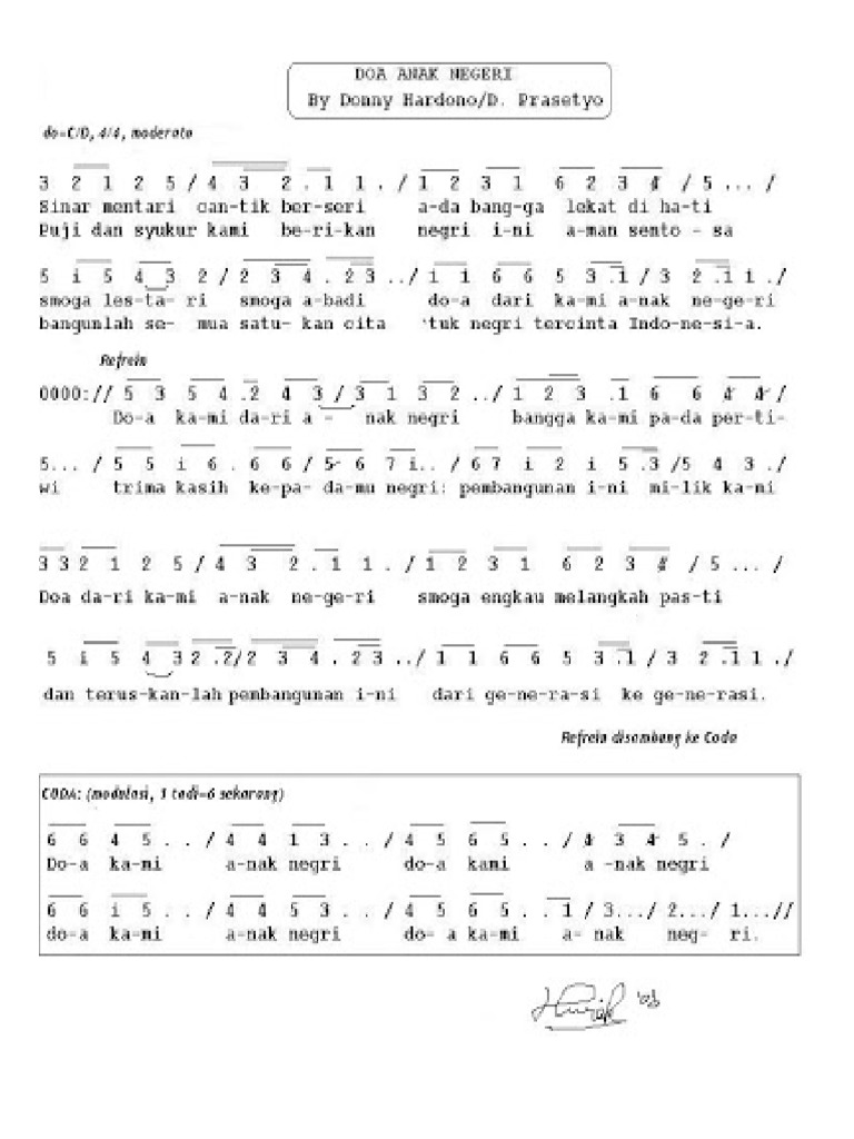 Not Angka Lagu Doa Anak Negeri Lagu ciptaan dari donny hardono tersebut terbilang sangat populer sekali di indonesia.